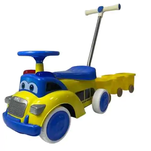 • Velika prednost ovog modela su tri odvojive prikolice, koje su savršene za prevoz igračaka, loptica ili drugih sitnica, čime se dodatno podstiče dečija mašta i kreativna igra. Volan koji se okreće daje detetu osećaj pravog upravljanja vozilom, dok odvojiva metalna ručka sa plastičnim drškama omogućava roditeljima potpunu kontrolu tokom šetnje.