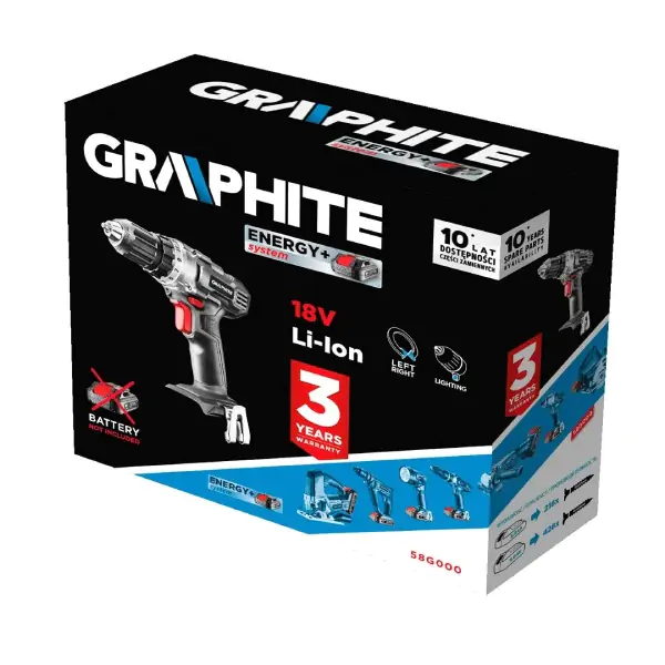 GRAPHITE 58G000 je akumulatorska bušilica visokih performansi namenjena profesionalnim i hobi majstorima. Radi na 18V Li-Ion baterijama iz Energy+ sistema (isporučuje se bez baterije i punjača), što omogućava fleksibilnu upotrebu sa drugim uređajima iz iste serije. Opremljena je dvostepenim prenosom (350 o/min i 1250 o/min), sa maksimalnim obrtnim momentom od 28 Nm (meko) i 44 Nm (tvrdo). Stezna glava bez ključa (0,8–10 mm) olakšava brzu zamenu pribora, dok kvačilo sa 19 podešavanja i opcijom bušenja omogućava rad u različitim materijalima. Ergonomska drška sa protivkliznim premazom i kompaktan dizajn pružaju udobnost i sigurnost tokom rada. LED osvetljenje automatski osvetljava radnu površinu, a električna kočnica i blokada vretena garantuju preciznost i sigurnost.