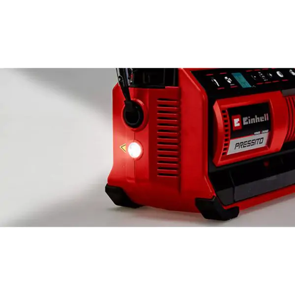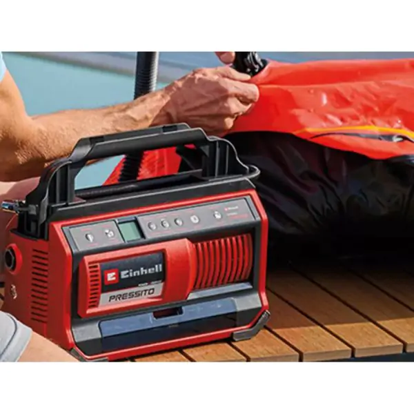 • Akumulatorski Kompresor PRESSITO 18/25 Hybrid Einhell je praktičan uređaj koji nudi fleksibilnost u upotrebi, omogućujući rad i sa napajanjima putem električnog kabla ili akumulatorske baterije. Idealan je za inflaciju automobilskih guma, biciklističkih točkova, lopti, kao i za napuhavanje i deflaciju vazdušnih dušeka.