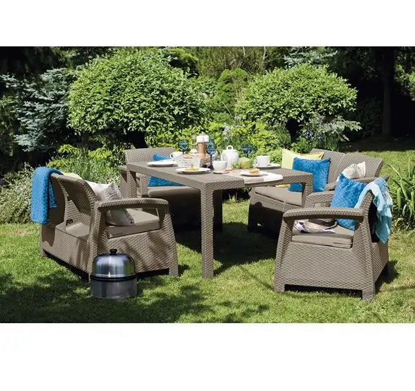 • Baštenski set Krf Fiesta, sastoji se od: dve fotelje, dve dvokrevetne sofe i velikog pravougaonog stola.
