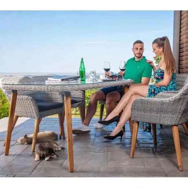 • Drvene nožice od akacije u prirodnoj boji dodaju toplinu i prirodan izgled, ističući se kao stilski detalj. Dimenzije stola 150 × 90 × 75 cm pružaju dovoljno prostora za udobno ručavanje sa porodicom ili prijateljima. Težina pakovanja od 16.25 kg olakšava transport i montažu.