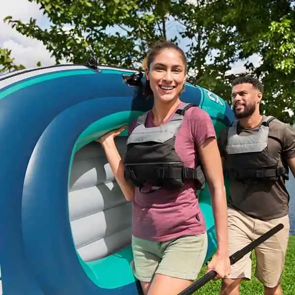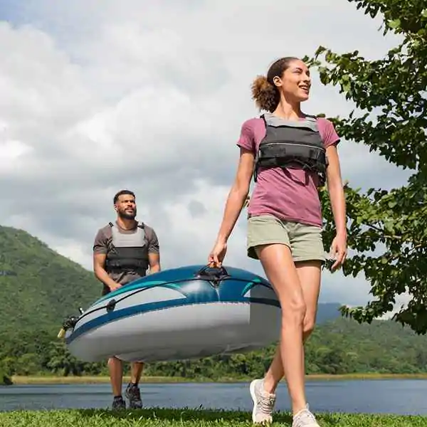 • Opremljen je ugrađenim držačima i stezaljkama za vesla, što olakšava rukovanje. Takođe, poseduje čvrstu ručku za nošenje, kao i sigurnosni obruč sa kanapima, što dodatno olakšava transport i sidrenje. Naduvani pod pruža dodatnu stabilnost i udobnost tokom vožnje, dok brzi ventili omogućavaju brzo naduvavanje i ispumpavanje.
