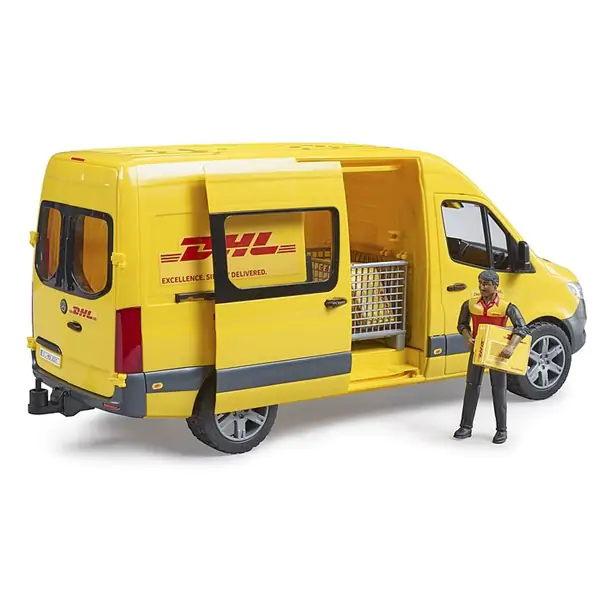 • BRUDER model je opremljen DHL drajverom, paletnim kavezom i tipičnim DHL paketima za otpremu.