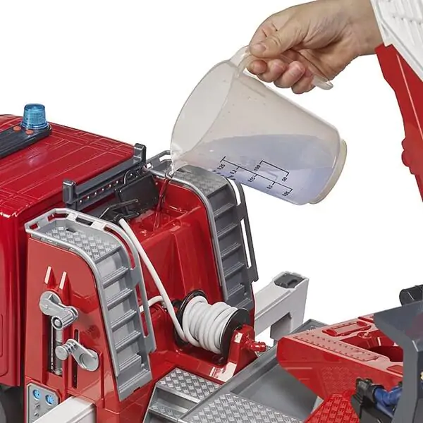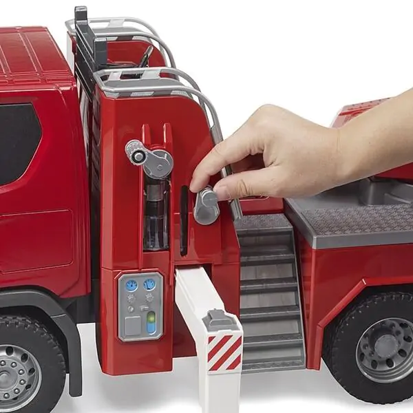 • Teško da postoji scena koja je uzbudljivija za rekreaciju od velike vatrogasne službe. Jedan vrhunac BRUDER asortimana vatrogasnih službi je Scania Super 560R vatrogasni kamion sa merdevinama. Pored svih detalja, poput otvaranja vrata, preklapanja retrovizora itd., vozilo ima i ugrađeni rezervoar za vodu koji se lako puni. Crevo za vodu se može namotati, držati BRUDER figurama (npr. artikal br. 60100 nije uključeno u obim isporuke) ili pričvrstiti na korpu za merdevine i ima potpuno funkcionalnu mlaznicu. Merdevine okretne ploče sa korpom za spasavanje mogu se produžiti i podesiti po visini pomoću ručnog točka. Pored dva sedišta u kabini, postoji i dodatno sedište za figuru bvorld na merdevinama vatrogasne službe. Četiri rastegljiva stabilizatora mogu osigurati da vozilo bude stabilno u svakoj situaciji, a veliki odeljak za odlaganje sa krilnim vratima pruža dodatni prostor za odlaganje alata. Modul za svetlo i zvuk artikla br.: 02801 sa četiri različite funkcije kao što su buka motora, trepćuće svetlo i šum sirene uključen je u obim isporuke i dodatno povećava vrednost ove složene vatrogasne službe. Vatrogasna stanica bvorld (br. artikla 62702) je idealan dodatak ovom uzbudljivom vatrogasnom vozilu.