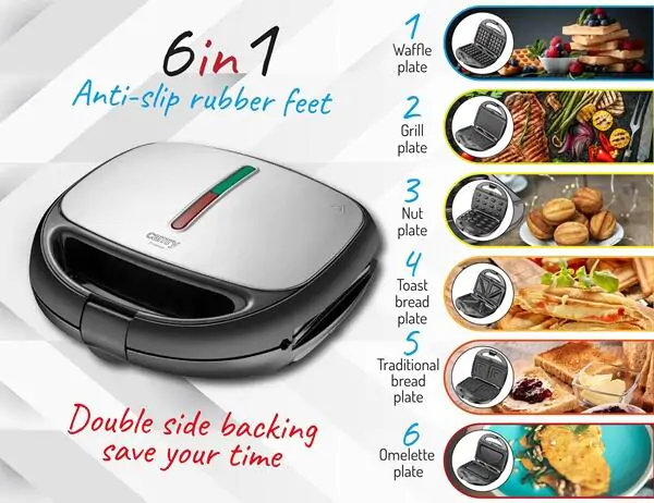 • Uređaj je opremljen sa 5 vrsta izmenljivih tanjira: za sendviče od tost hleba (tanjir sa trouglovima za tanje sendviče), za tradicionalne hlebne sendviče (tanjir sa četvrtastim udubljenjima za deblje sendviče), za roštilj (tanjir sa uzdužnim žlebovima), za vafli (karirani tanjir), za kolače tipa "orasi" (tanjir sa žlebovima za kuglice od testa), tanjir za omlet (tanjir sa okruglom)
