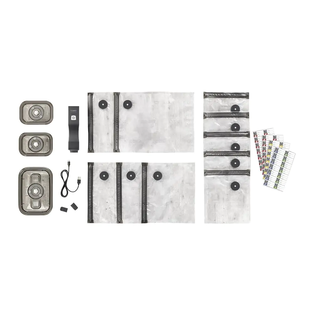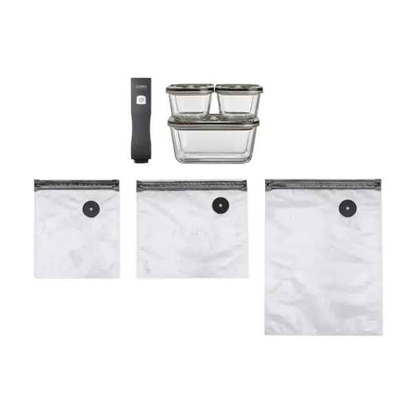 • CASO praktičan eko set za vakumiranje hrane sadrži "Vacu OneTouch" uredjaj za vakumiranje, 10 vakuum kesa (5 komada 20 x 23 cm, 3 komada 26 x 23 cm, 2 komada 26 x 35 cm), 3 staklene vakuum posude, 2 zatvarača vakuum kesa, USB-C kabl za punjenje i CASO stikere za obeležavanje hrane.