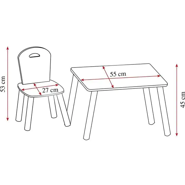• Sa dimenzijama od 55 x 55 x 45 cm za sto i 27,5 x 27,5 x 50,5 cm za stolice, ova garnitura je savršeno prilagođena dečijim potrebama. Laka konstrukcija i neophodna montaža čine ovaj sto i stolice lako postavljivim i čišćenjem, što je veliki plus za roditelje koji traže praktičan i funkcionalan komad nameštaja za svoju decu.