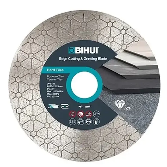 BIHUI DPE125 je profesionalni dijamantski disk namenjen za poliranje i brušenje pod uglom od 45°. Sa dvostrukim slojem dijamantskog oboda pune visine od 25 mm i toplopresovanim čeličnim telom debljine 2,0 mm, obezbeđuje visoku čvrstoću, krutost i dug vek trajanja. Disk omogućava brzo i precizno sečenje sa minimalnim lomljenjem i efektom samohlađenja, što ga čini idealnim za rad sa tvrdim, porcelanskim i keramičkim pločicama. Pogodan je za profesionalnu upotrebu u keramičarskim i građevinskim radovima gde je potrebna visoka preciznost.