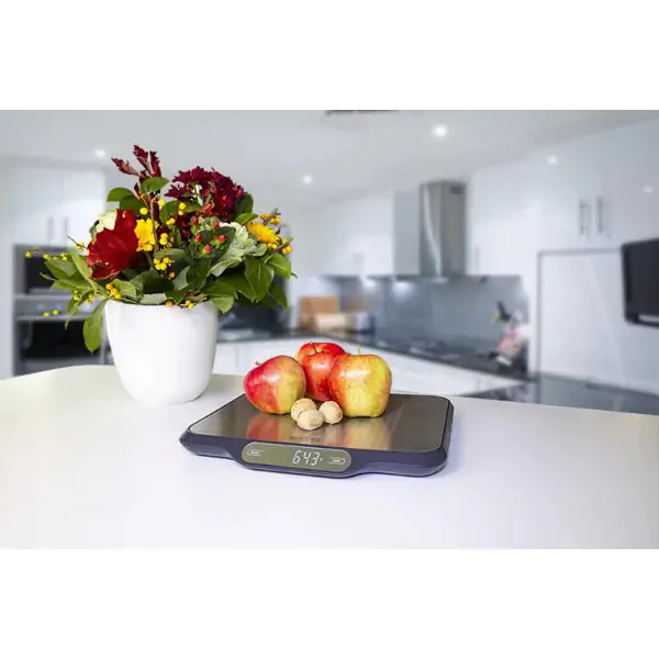 • ECG kuhinjska vaga u elegantnom dizajnu od nerđajućeg čelika donosi preciznost, pouzdanost i moderan izgled u vašu kuhinju, čineći svakodnevno kuvanje i pripremu hrane jednostavnijim i tačnijim. Sa maksimalnim kapacitetom od 15 kg i preciznošću merenja od 1 g, ova digitalna vaga idealna je za merenje sastojaka od najmanjih količina do težih namirnica. Veliki LED displej omogućava lako očitavanje izmerenih vrednosti, dok intuitivne funkcije Add and weigh (dodavanje i merenje) i TARA (resetovanje) olakšavaju merenje više sastojaka u istoj posudi bez komplikovanog računanja. Touch kontrola pruža savremeno i jednostavno upravljanje, a površina od nerđajućeg čelika je otporna na ogrebotine i laka za čišćenje. Protivklizne stopice obezbeđuju stabilnost tokom upotrebe, dok funkcija automatskog isključivanja (auto-off) produžava vek trajanja baterija (4 x 1,5 V AA). Kompaktnih dimenzija i srebrne boje, ova vaga se lako uklapa u svaki kuhinjski prostor.