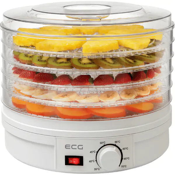 • ECG dehidrator za hranu sa 5 posuda za sušenje predstavlja savršenog pomoćnika za prirodno konzerviranje voća, povrća, začinskog bilja, mesa i drugih namirnica, bez dodavanja konzervansa i šećera. Sa pet prozirnih posuda prečnika 32 cm, koje se mogu proširiti do maksimalno 10, omogućava vam da pripremite zdrave grickalice, sušeno voće za zimnicu ili ukusno sušeno meso po sopstvenom receptu. Kontinuirano podesivi termostat u rasponu od 35 do 70°C omogućava vam da precizno prilagodite temperaturu svakoj vrsti namirnice, čuvajući njihove hranljive vrednosti i prirodan ukus. Ugrađeni ventilator obezbeđuje ravnomernu cirkulaciju toplog vazduha i 3D funkciju sušenja, garantujući konzistentne rezultate bez potrebe za premeštanjem posuda. Tih rad i prozirno telo omogućavaju vam da pratite proces sušenja bez ometanja, dok zaštita od pregrevanja i protivklizne stopice obezbeđuju siguran rad. Uz uređaj dobijate i priručnik sa receptima i korisnim savetima za početak vaše avanture u svetu dehidriranja.