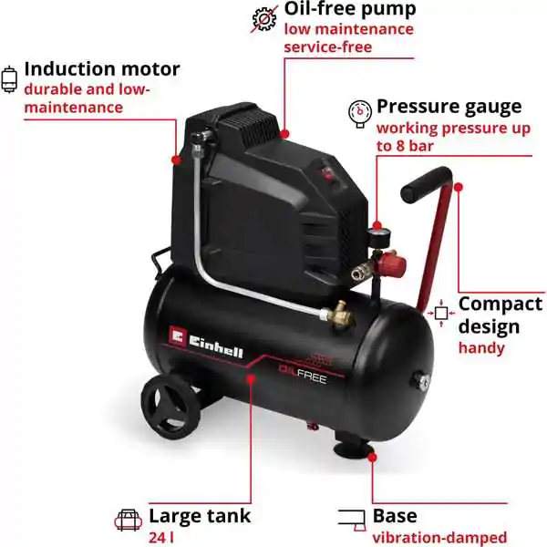 • Einhell kompresor za vazduh TC-AC 190/24/8 I OF predstavlja snažno i pouzdano rešenje za rad u radionici, garaži i pri raznim kućnim majstorskim poslovima. Robustan indukcioni motor snage 1100 W obezbeđuje stabilan i kontinuiran rad čak i pri zahtevnijim primenama, dok bezuljna pumpa omogućava minimalno održavanje i dug vek trajanja uređaja. Usisni kapacitet od 190 l/min i radni učinak do 75 l/min pri pritisku od 4 bar čine ovaj kompresor pogodnim za naduvavanje, duvanje, lakše pneumatske alate i druge uobičajene zadatke sa komprimovanim vazduhom.