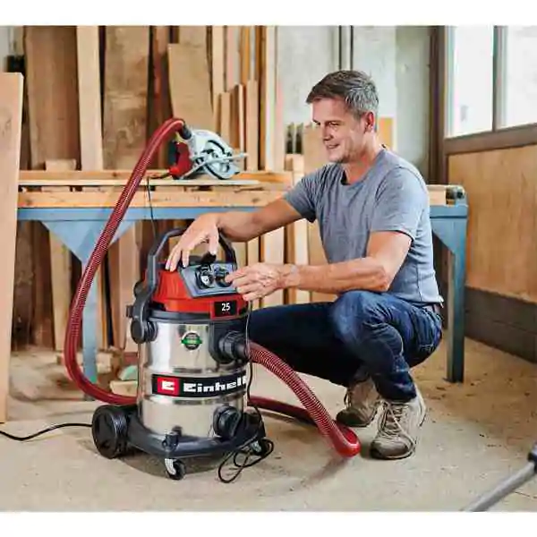 • Einhell TE-VC 2580 SACL je snažan i svestran usisivač namenjen suvom i mokrom čišćenju u domaćinstvu, radionici i na gradilištu. Motor snage 1100 W obezbeđuje usisnu snagu do 200 mbar, uz mogućnost kontinuiranog podešavanja kako bi se rad prilagodio osetljivim površinama i različitim uslovima čišćenja. Uređaj je usklađen sa L klasom zaštite od prašine prema evropskim standardima i efikasno filtrira štetne čestice poput gipsa, kreča, peska i zemlje, čime je pogodan i za zahtevne građevinske radove.