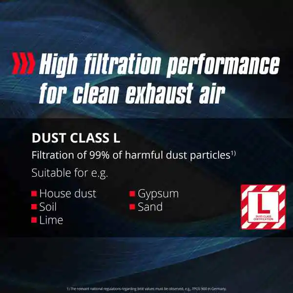 • Automatska utičnica za električni alat omogućava sinhronizovano uključivanje usisivača sa priključenim uređajem, čime se obezbeđuje efikasno odvođenje prašine tokom rada. Teleskopska cev od nerđajućeg čelika sa regulatorom protoka vazduha, robusno usisno crevo dužine 3 metra i kabl dužine 5 metara omogućavaju radni radijus do 8 metara i veliku slobodu kretanja. Veliki točkovi, držači za pribor, namotavanje kabla i nosač cevi omogućavaju jednostavan transport i uredno skladištenje.