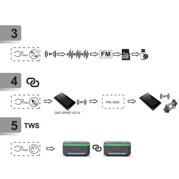 • Naziv proizvoda: Gembird Digitalni sat+alarm sa bežičnim punjenjem, zvučnikom i FM radiom - DAC-SPKBT-QC15-BK