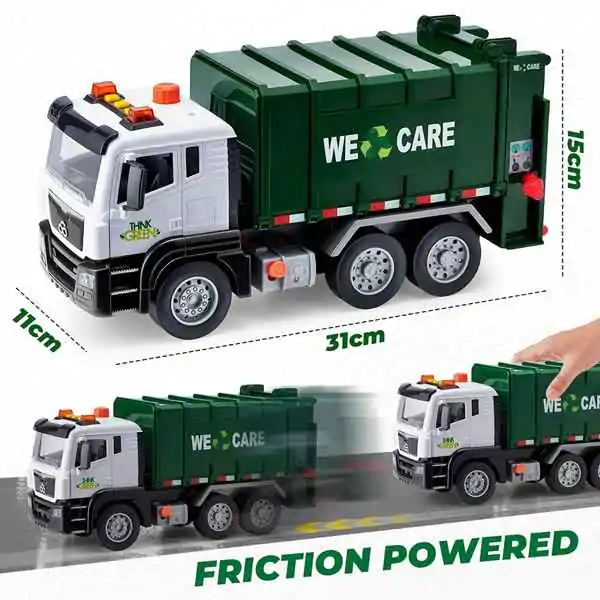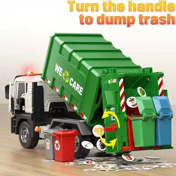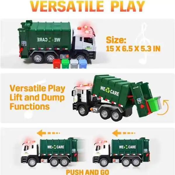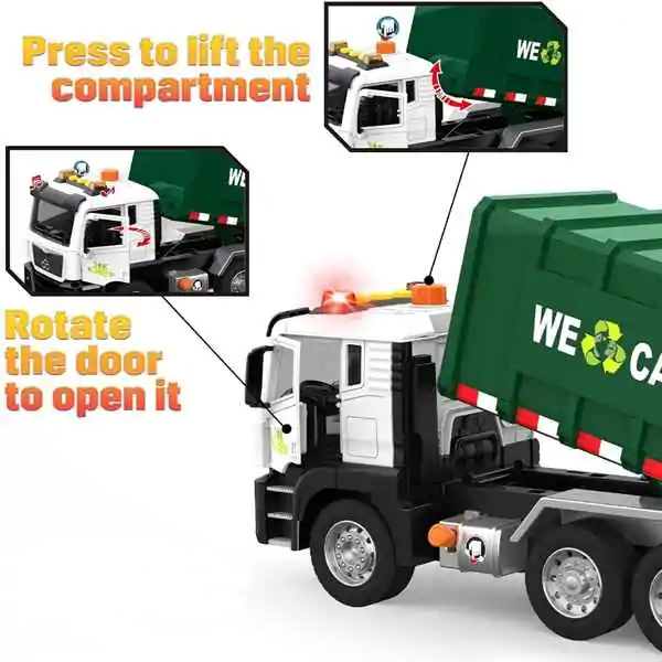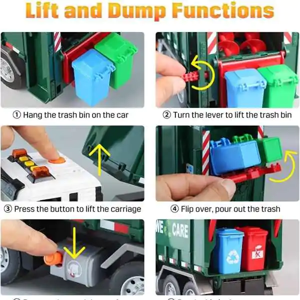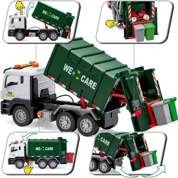 • Kamion poseduje realistične funkcije koje dodatno obogaćuju iskustvo igre. Kante se mogu zakačiti na zadnji deo kamiona, a pomoću pokretne poluge „otpad“ se prazni kao kod pravog vozila za odvoz smeća. Točkovi rade na principu trenja, pa dete može gurati kamion bez baterija. Tu su i svetlosni i zvučni efekti koji igru čine još zanimljivijom i realističnijom.