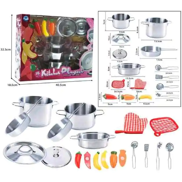 • Ovaj atraktivan set sadrži metalne šerpice i kuvarski pribor koji oponaša pravi alat, čineći igru još realističnijom