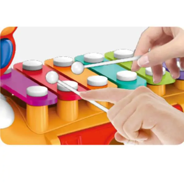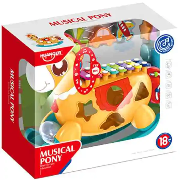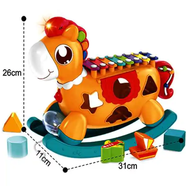 • Interaktivni muzički konjić je sadži 7 umetaljki različitih geometrijskih oblika u crvenoj, plavoj, zelenoj, žutoj i ljubičastoj boji, kao i ksilofon sa udaraljkom