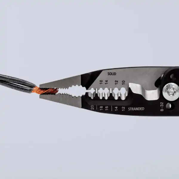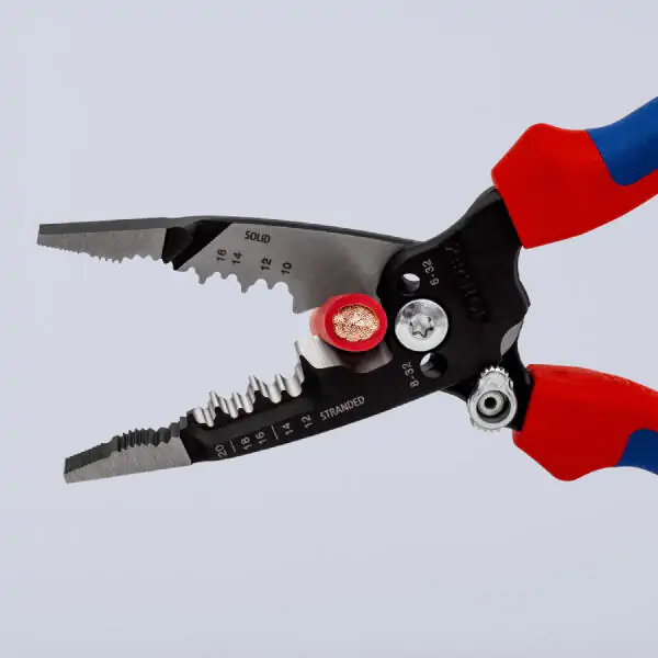 • 13 72 8 Knipex WireStripper Brže uklanjanje izolacije: precizno pozicioniranje žice zahvaljujući rebrima za lokaciju. Inovativna geometrija rezne ivice, posebno jake rezne ivice: 50% veći kapacitet sečenja i 25% manji napor sečenja u poređenju sa standardnim kliještima za smicanjenje omotača ili izolacije. Brzo rezanje navojnih šipki i vijaka bez ivica dimenzija UNC 6-32 i 8-32 do klase 4,6. Precizno brušena: profili za skidanje izolacije za vodiče od 18 – 10 AWG (puni) i 20 – 12 AWG (fino upleteni). Jednostavno rezanje bakrenih i aluminijskih kabla prečnika do Ø 15 mm (1/2 inča). Višenamjenske stezne površine za pouzdano stezanje, držanje i savijanje pljosnatog i zaobljenog materijala, kao i za savijanje žica. Iznimna stabilnost i dostupnost zahvaljujući hibridnim vrhovima, koji su pljosnati i široki, na glavi klešta. Praktično: prikladna širina otvora i ergonomski oblik drška, ugrađena opruga za otvaranje olakšava učestalo rezanje. Idealno za dešnjake i ljevake: napravom za blokadu može se rukovati sa obe strane. Ravni spoljašnji rubovi čeljusti za rad na podžbuknim razvodnim Kutijama i uklanjanje ivica iz otvora za provlačenje. - Vrednost rezanja bakarnog kabla, višežilni: Ø 15mm - Vrednost rezanja bakarnog kabla, višežilni: 1/2in - AWG: 20 — 10