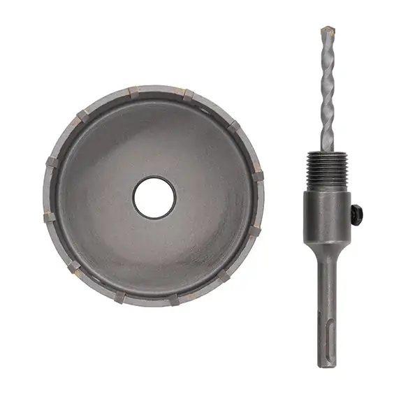 • Profesionalni BLADE BKB set kruna za beton uključuje centralnu burgiju i SDS Plus adapter, pogodan za bušenje različitih zidnih materijala poput betona, cigle, nepečene cigle, cementa i kamena. Krune su izrađene od vrhunskog čelika 40Cr i legure volframa, dok su vrhovi (zubi) od tvrde legure koja garantuje superiornu robusnost i dug vek trajanja alata.