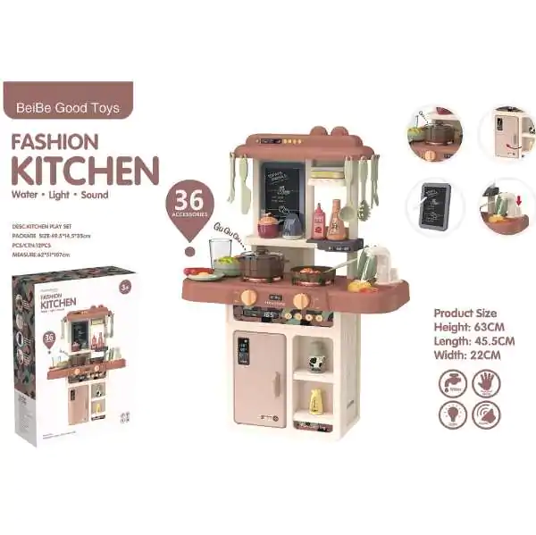 Прво и основно: испорука кратког рока! Испоштовано све једноставно и лако! Кухиња прелепа за дете од 2,5 године са звуком кувања и пржења. Нисмо се снашли да тече вода кроз чесмицу али , искрено, није ни потребно да се дете не кваси. Свакако се " перу "судови и поврће. Пластика је обојена неким финим тоновима што ми је битно. Опремљеност кухињице је таква да има све што је потребно за играње по цео дан