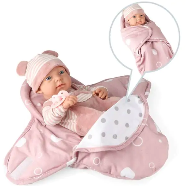 • Lutka beba od gume 38cm u odelcetu nezno roze boje sa cuclom u mekanoj nosiljci 40cm koju dete može nositi u rukama,položiti u krevetac i slično
