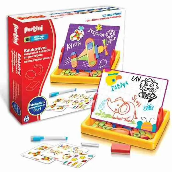 Magnetni koferčić sa postoljem geometrijski oblici PertiniEdukativni -magnetni koferčic sa postoljem geometrijski oblici -set sadrži tablu sa postolje ...