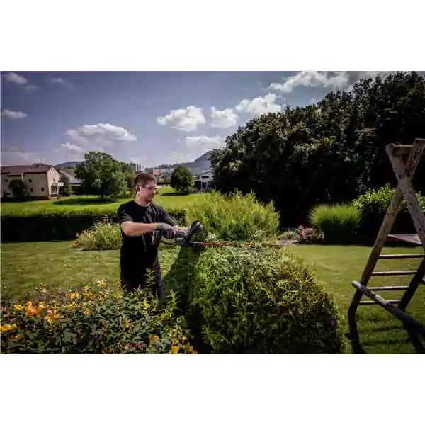 • Sa naponom baterije od 18 V, dužinom sečiva od 55 cm i mogućnošću sečenja do 53 cm, ovaj trimer je snažan alat za održavanje živih ograda. Težina trimer bez baterije je 2,2 kg, dok sa baterijom iznosi 2,6 kg.