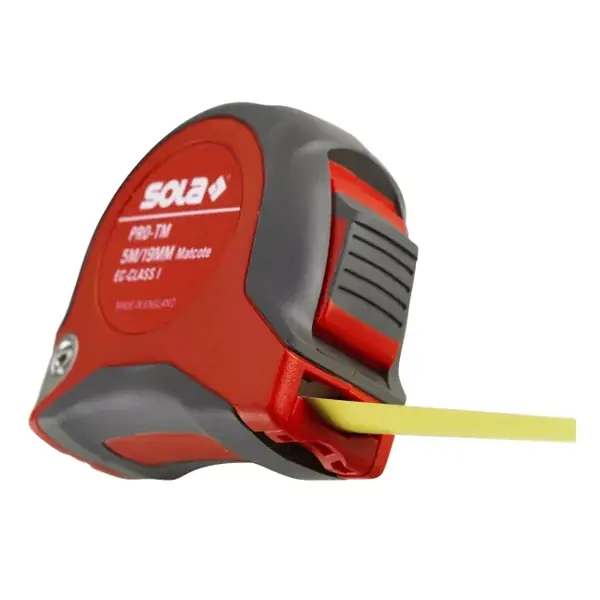 Profesionalni metar SOLA PRO-TM dolazi sa čeličnom mernom trakom dostupnom u dužinama od 3 i 5 metara. Kućište je izrađeno od kombinacije ABS i TPE materijala, što pruža čvrstinu i dugotrajnost, dok dvostruka kočnica omogućava precizno merenje. Širina trake iznosi 19 mm, a alat spada u EC – I klasu tačnosti, idealan za precizne stolarske i građevinske radove.