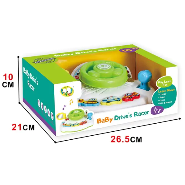 • Sa prednje strane volana je postavljen niz autića, kao i dodatni tasteri, čijim se pritiskom aktiviraju zvučni efekti. Igračka za bebe je izradjena od plastike, u vedrim bojama i dečijim motivima, dimenzija 26,5x21x10 cm.