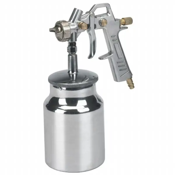 • Ovaj uređaj je pogodan za farbanje i lakiranje, pružajući kontinuirano promenljive boje disperzija sa podesivim mlazom i konusnim mlaznicama. Ima mušku spojnicu i dolazi sa donjom usisnom posudom.
