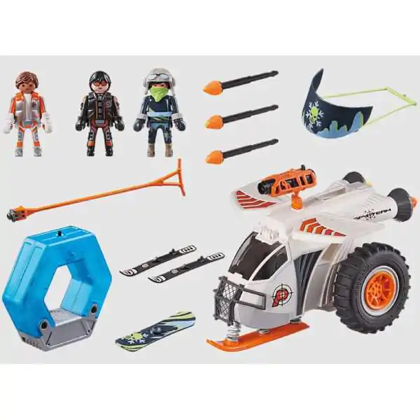 • Sadrži: 3 Playmobil figure, 1 dasku za sneg, 1 padobran, 3 oružja, 3 projektila, 1 LED luk, 1 jedrilicu za sneg, 2 skije