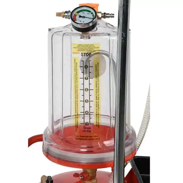 • Uređaj je opremljen rezervoarom zapremine 70 litara, kao i kontrolnim rezervoarom od 10 litara, koji omogućava preciznu kontrolu količine isisanog ulja. Široki levak od 10 litara dodatno olakšava pražnjenje ulja gravitacionim putem. Posebna prednost je mogućnost detaljnog usisavanja zaostalog ulja iz creva i kanala, čime se postiže temeljno održavanje sistema podmazivanja.