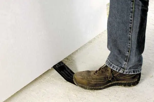 • Jednostavno gurnite ispod uspravne daske, podignite dasku nagore pomoću nožne poluge i zatim pričvrstite zavrtnjima. Integrisana kuka se može koristiti za guranje dasaka zajedno bez napora. Podizač dasaka je takođe pogodan za skidanje teških krila vrata sa njihovih šarki.