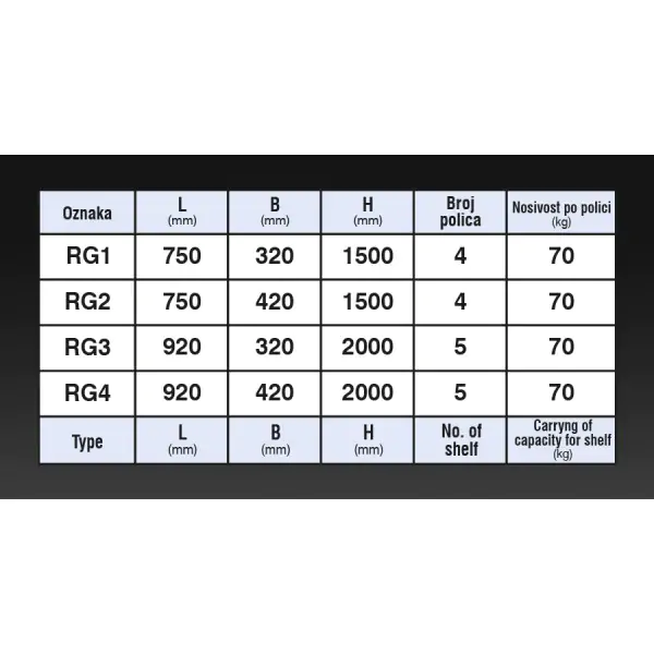 • Izrađeni od visokokvalitetnog čelika, regali RG4 Elegant garantuju izuzetnu izdržljivost i dugotrajnost. Njihove dimenzije od 2000x920x420 mm prilagođene su kako bi se maksimalno iskoristio prostor, pružajući dovoljno visine i dubine za skladištenje raznovrsnih predmeta.