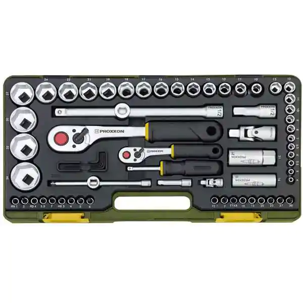 • Proxxon set nasadnih ključeva sa 1/4" i 1/2" prihvatom, sadrži 65 delova, predstavlja vrhunac alata za precizan i efikasan rad u različitim uslovima.