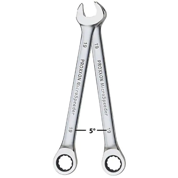 • Proxxon garnitura viljuškasto-okastih ključeva MicroSpeeder od 7 delova, veličine od 8mm do 19mm, dizajnirana je za rad u uskim i teško dostupnim prostorima. Sa ugrađenim mehanizmom sa čegrtaljkom, omogućava brzo i efikasno zatezanje ili otpuštanje vijaka bez potrebe za skidanjem ključa sa glave vijka.