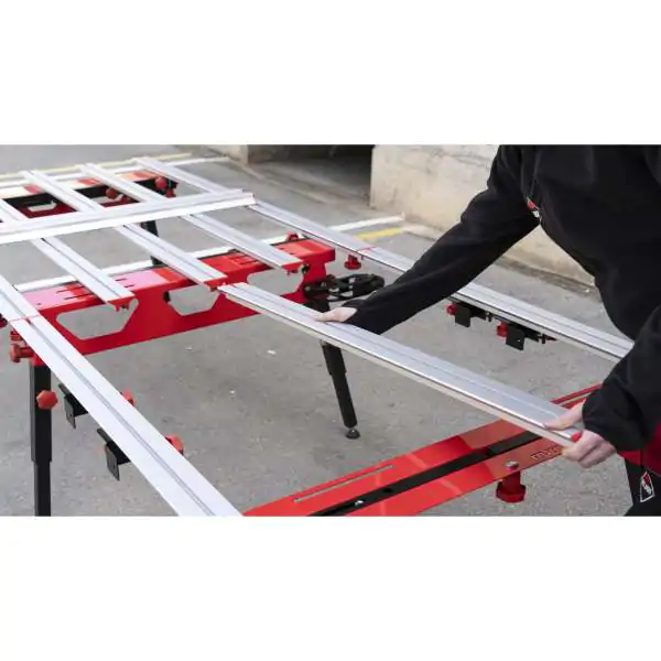 • Sa dva pomična tragača i širokim profilima u obliku slova T, ovaj sto pruža površinu za podršku koja omogućava rad kao na radnom stolu za upotrebu manjih alata, kao što su ručni sekači.