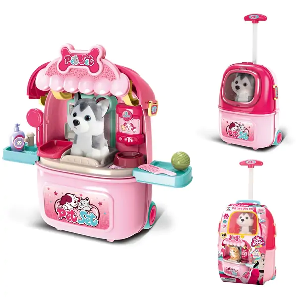 • Ceo kozmetički salon staje u roze kofer na točkovima sa ručkom koja se uvlači. Mališan može svuda sa sobom poneti igračku i svog prijatelja. Pogodan za transport i nošenje. Stavite svu dodatnu opremu na dno ranca, uklonite bočne police i gotovi ste. Prozirni prozor sa rupama će vam omogućiti da stalno posmatrate svog ljubimca igračaka. Na putu, kada naš pas ogladni, možemo otvoriti prozor i dati mu hranu. Cela stvar daje mnogo mogućnosti za igru i zadovoljiće svako dete, neće moći da se rastane od ovog kompleta.