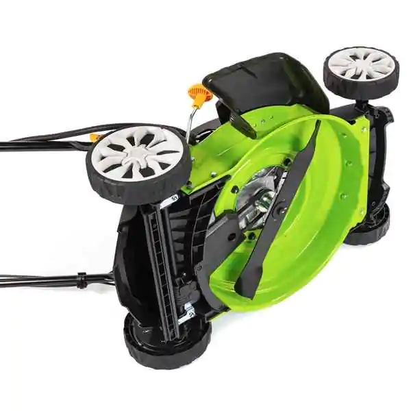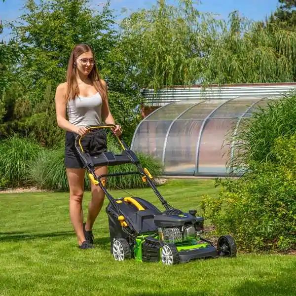 • Iako kosačica ima ukupnu težinu od 35 kg, njen dizajn i visokokvalitetni točkovi sa ležajevima omogućavaju lako rukovanje i manevrisanje po celom travnjaku. Podesiva ručka sa mekim poklopcem poboljšava udobnost korisnika, čineći košenje manje napornim i prijatnijim.