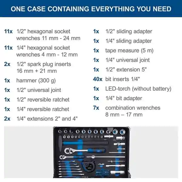 • 11x 1/2" šestougaoni nasadni ključevi 11-24 mm/ 1/2" kardanski spoj / 1/2" reverzibilna čegrtaljka / klizni adapter / 1/2" produžetak 5" / ključ za svećice 16 i 22 mm / nasadni ključevi 1/4" /