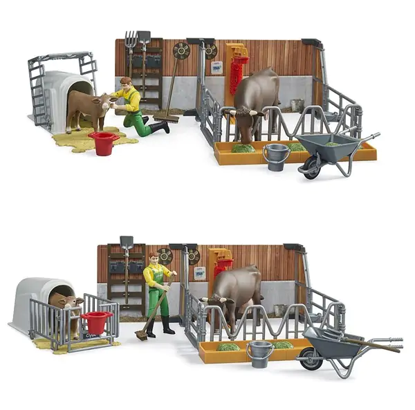 • Postoji radostan porast u poljoprivrednom sektoru. Pored već poznatih krava i bikova, sada postoji i odgovarajuće tele u asortimanu Bruder. Potpuno novi bworld komplet tema za šupu za krave i telad uključuje modernu štalu za krave sa koritom za hranu i četkama za masažu. Za bezbedan smeštaj teleta u kompletu je i boks za telad sa pojilom. Obe životinje dobro čuva farmer, koji je takođe uključen, koji koristi kolica i pribor i za hranu i za čišćenje šupe.