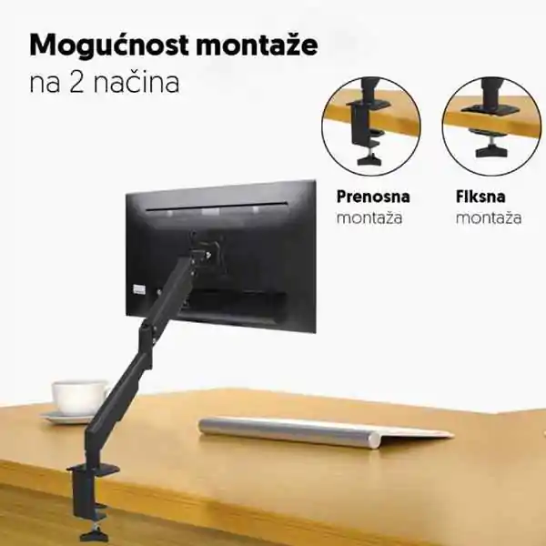 • Udaljenost od zida može se prilagoditi u opsegu od 52 do 484 mm, a VESA standard podržava montažu do 100 x 100 mm. Montaža je jednostavna – nosač se može pričvrstiti pomoću metalne stege ili direktno šarafima, u zavisnosti od tipa radne površine.
