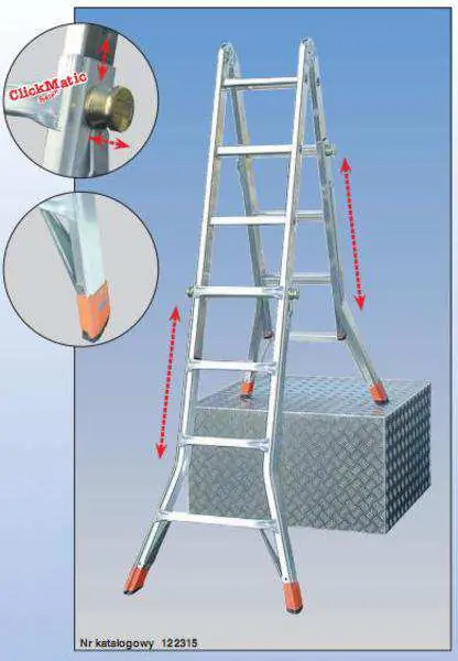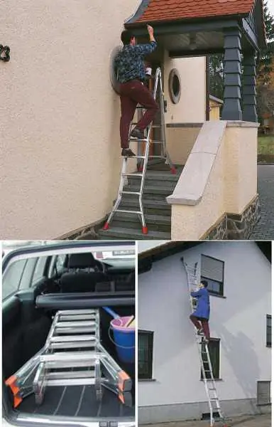 • Četvorodelne teleskopske, zglobne merdevine od aluminijuma koje mogu da se koriste kao samostojeće, prislone merdevine ili kao skela – uz dodatak radne ploče.