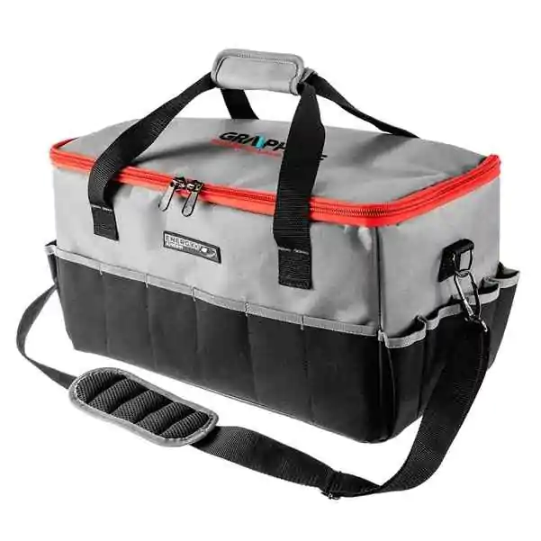 • GRAPHITE torba za alat ENERGY+ opremljena je čvrstom ručkom i podesivom naramenicom za udoban transport. Prenosiva torba za alat pogodna je za rad na terenu, radionice ili gradilišta.