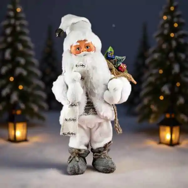 • Ima belu bradu i nosi smeđe čizme sa kanapom oko članka, što mu daje rustični izgled. Preko ramena nosi džak napravljen od materijala nalik juti, ispunjen šarenim poklonima i zelenim grančicama.
