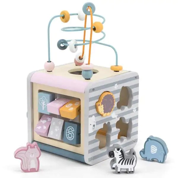 • Na zidovima edukativne kocke nalazimo: - sorter oblika sa figurama životinja (jež, zebra, slon i veverica), - lavirint sa životinjama, - 3 rotirajuća zupčanika i 1 krug sa rupom, - dvostrane, rotirajuće kocke sa brojevima od 1 do 6