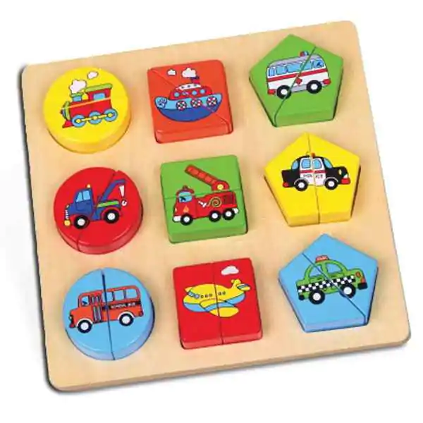 • Edukativna slagalica umetaljka koja se sastoji od 9 dvodelnih drvenih puzzli sa motivima saobraćajnih sredstava koje se spajaju u formu geometrijskih tela (3 oblika i 4 boje), a potom se umeću na odgovarajuća polja na drvenoj tabli