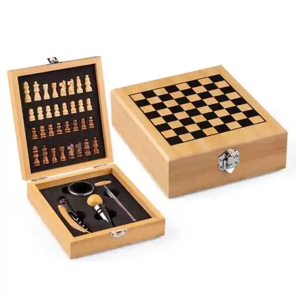 • Set za služenje vina sa šahom Winer Eco izrađen je od bambusa, kombinujući dve elegantne aktivnosti – uživanje u vinu i igranje šaha. Kutija ima gornji poklopac sa šahovskom tablom, dok unutrašnjost sadrži sve potrebne dodatke za posluživanje vina i komplet šahovskih figura.