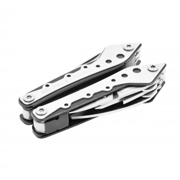 • Od alata poseduje sledeće: krstasti šrafciger, makaze, otvarač za flaše, srednji i veliki pljosnati šrafciger, malu testeru, kombinovana klešta, sečice, turpiju i nož