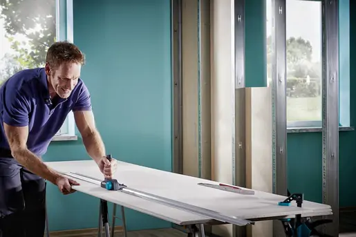 • Rezač gipsanih ploča sa šinom čini sečenje gipsanih ploča što je moguće lakšim, uz mogućnost zarezivanja, lomljenja i sečenja u jednom prolazu. Pametan pomoćnik za ugradnju gipsanih ploča vas štedi od neprekidne potrebe da pomerate, okrećete i držite glomazne gipsane ploče. Takođe garantuje savršene rezne ivice.
